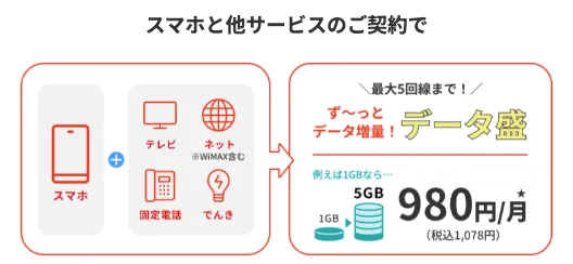 他サービスとの組み合わせで「データ盛」が適用され、実質的に使える容量が増えるため、スマホをよりお得に使えます。