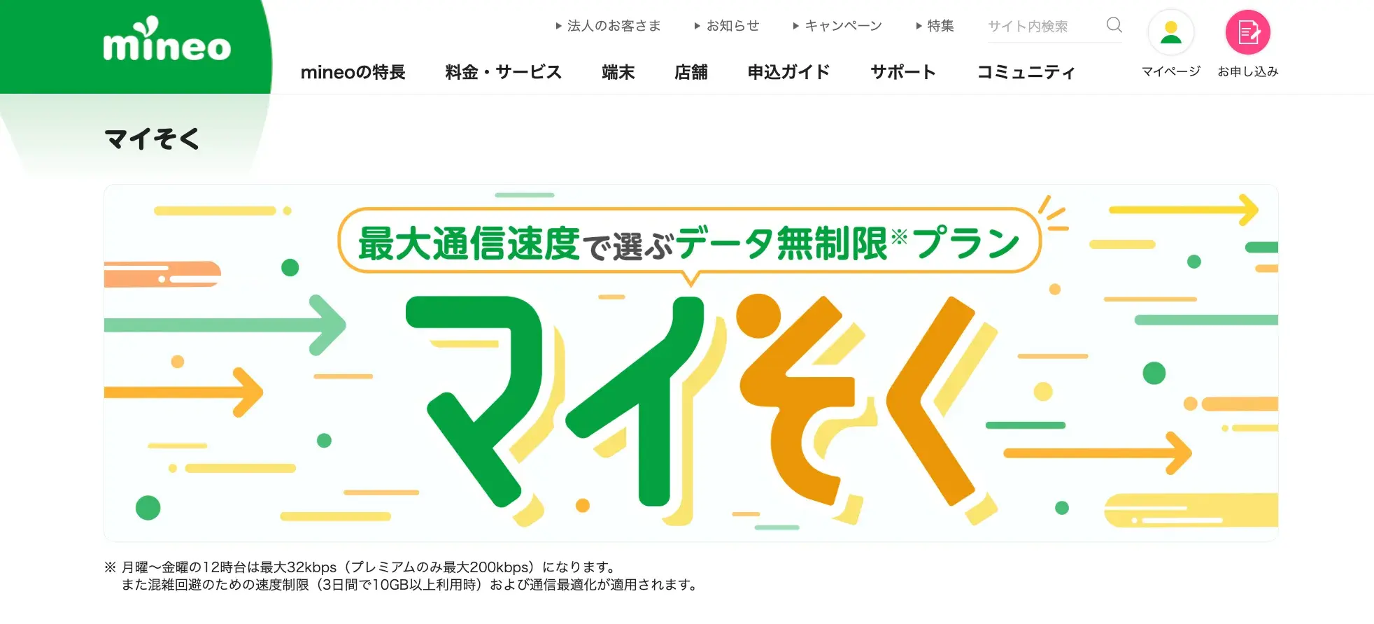 mineoは、月額250円から利用できるデータ無制限プラン「マイそく」など、独自の料金プランが最大の魅力です。
