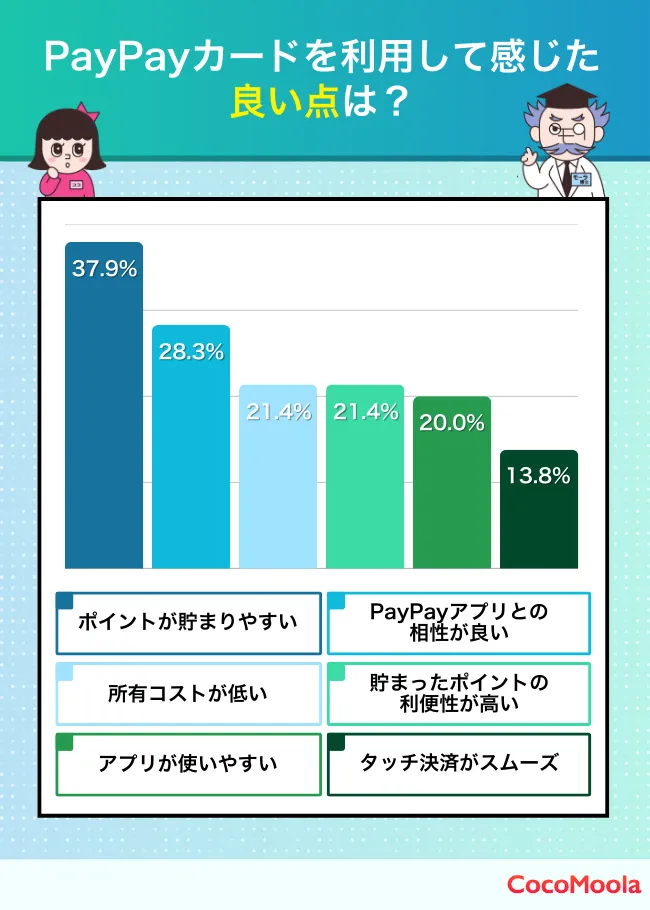 次いで多く挙げられたのは「PayPayアプリとの相性が良い」点で、全体の約28%の方が回答しました。カードをアプリに登録すればチャージ不要でPayPayを利用できるようになり、PayPayユーザーにとってまさに必需品と言えるでしょう。