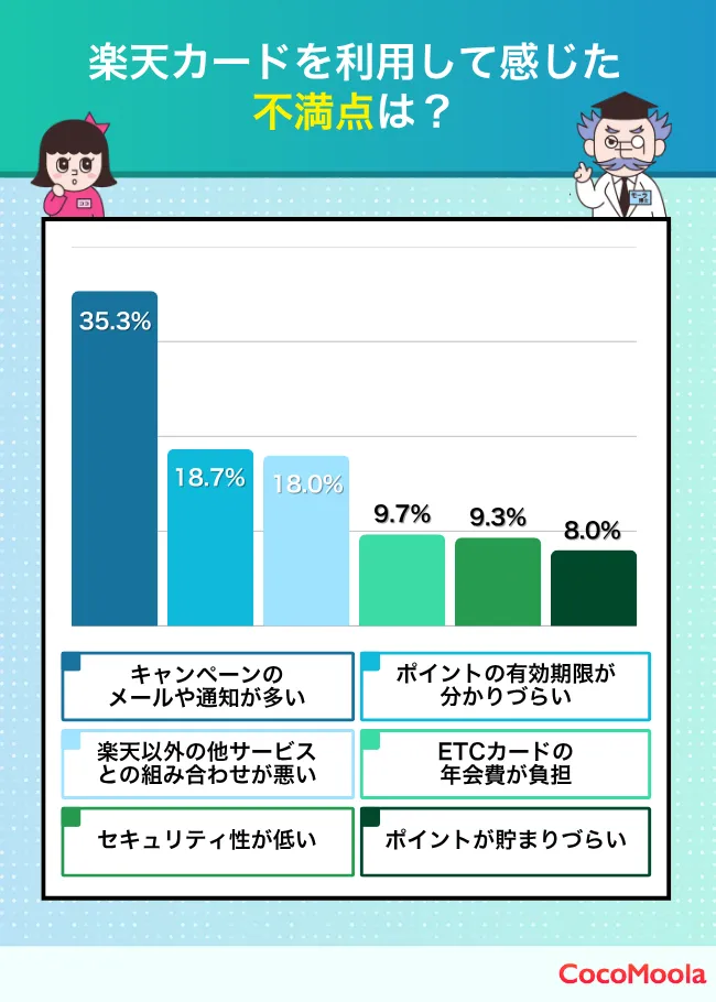 デメリットは今のところ感じていませんが、あえて言えば、一般カードですので、ゴールドカードに比べ、毎月の”ご利用枠”が低いところです。光熱費、通信費、サブスクなどの固定費、毎月の食料、日用品の買い物に加え、突発的な高額商品の買い物まで集約するのは少し苦しいかもしれません。私の場合は楽天カードだけでは上限を超えてしまうため、もう一枚別のカードと二刀流で使用しています。