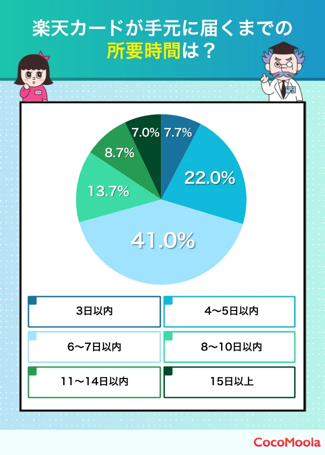 楽天カードが手元に届くまでにかかった時間は「6〜7日以内」が最多で、全体の41%。また、「3日以内」が約8%、「4〜5日以内」が22%となっており、合計すると約71%の方が1週間以内でカードを発行できていることになります。