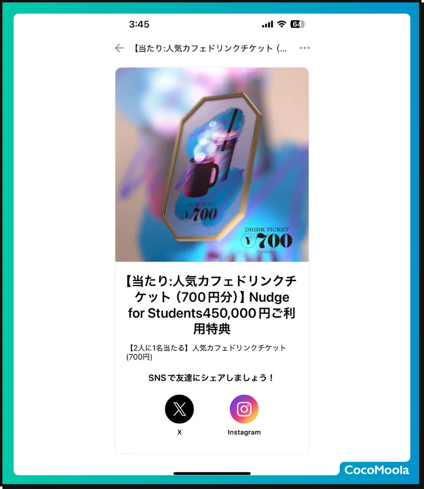 さらに、たまたま同じ日にアプリで加入していたクラブ特典でスターバックスコーヒー様のドリンクチケットが抽選で当たり、とてもテンションが上がり嬉しかったことを今でも覚えています。