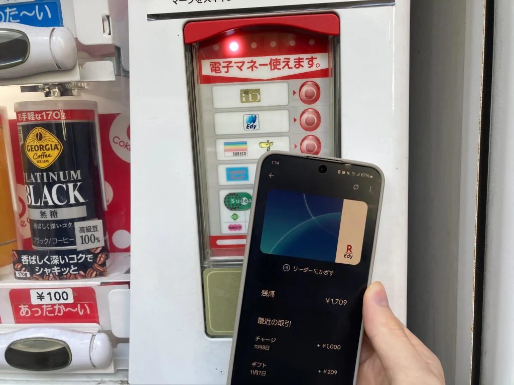 実際に、自動販売機で利用してみました。まずは、欲しい飲み物のボタンを押します。その後、自販機のパネルまたはボタンから楽天Edyを選択。その後、スマホを自動販売機の読み取り箇所にかざせば、お支払い完了です。