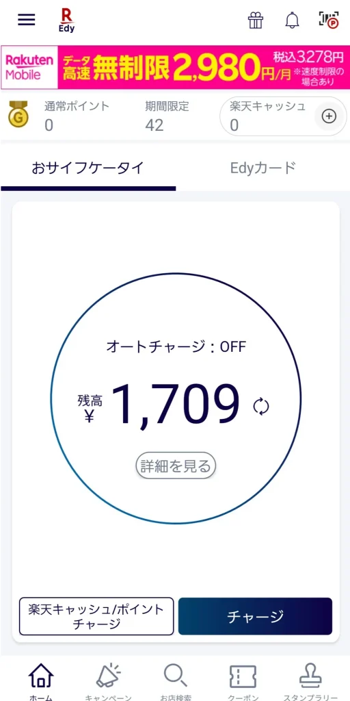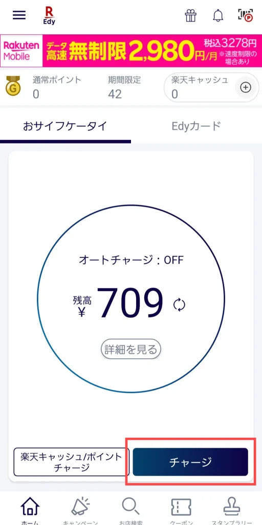 まずは「楽天Edyアプリ」を開き、「おサイフケータイ」メニューの右下にある「チャージ」をタップ。