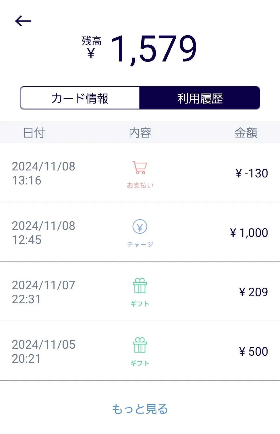右側の「利用履歴」に切り替えれば、過去のチャージ額や支払い額を一目で確認することができます。
