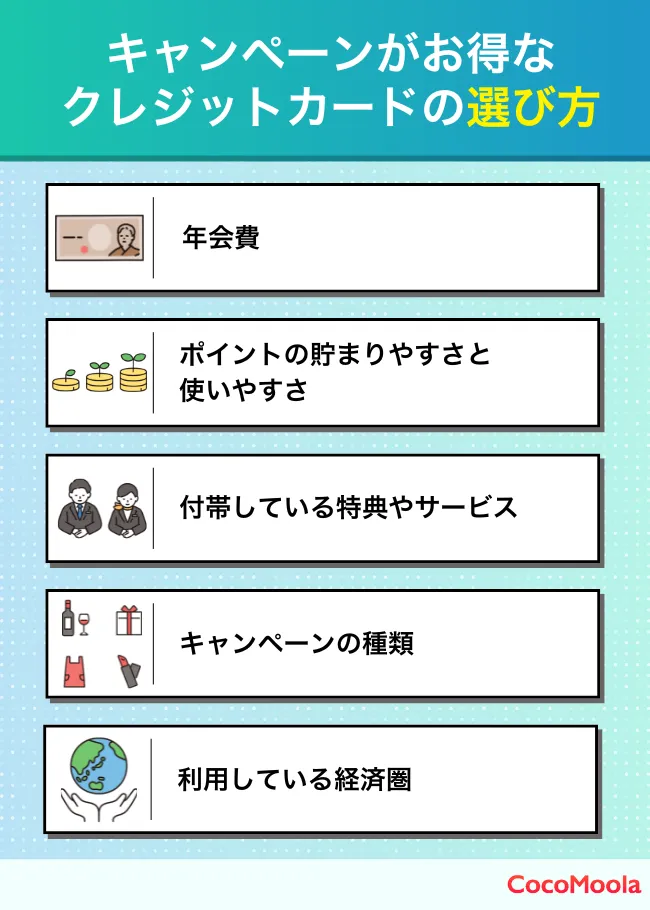 ただし、中には「数十万円の利用が必要」や「友人紹介が条件」など、達成が難しいケースもあります。特典の金額だけを見て申し込んだものの、ほとんど特典を受け取れなかったという失敗も少なくありません。よって、「キャンペーンの内容がお得そうだから」とすぐに決めるのではなく、申し込む前には記事内でご紹介しているクレジットカードの選び方を意識するのがおすすめです。