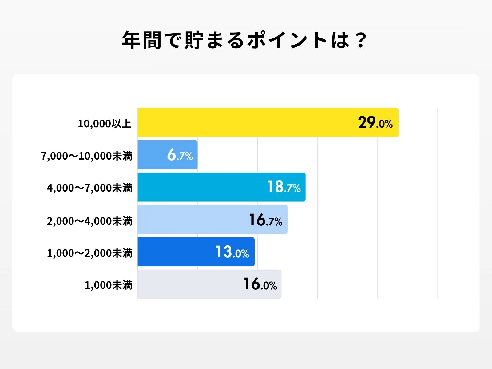 最も多かった回答がなんと「10,000ポイント以上」でした。還元率が1.0%のクレジットカードで毎月90,000円以上使っている計算となります。