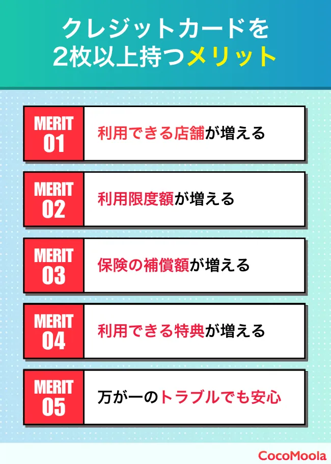A、利用できる店舗や利用限度額が増えること、異なるポイントを貯めやすいこと、カードごとの特典を受けられることなどのメリットがあります。