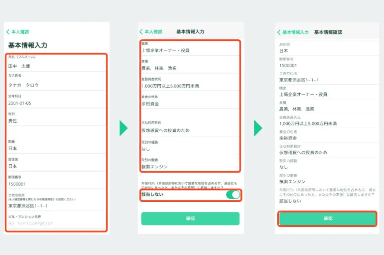 本人確認書類を提出する前に、氏名、生年月日、性別、職業などの基本情報をアプリ内で入力します。