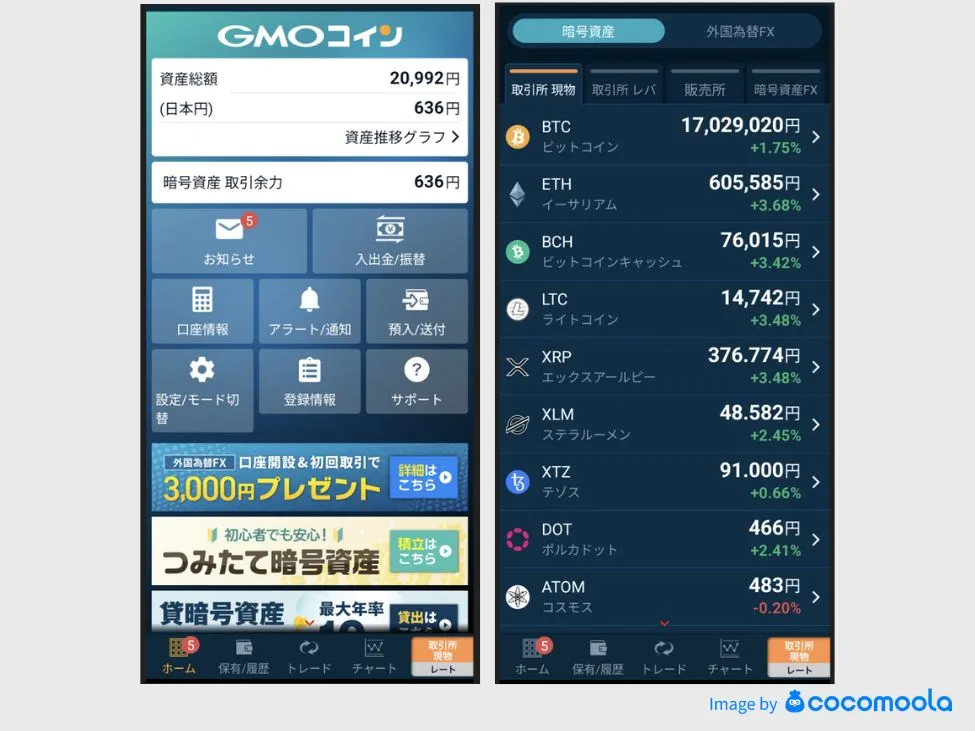 GMOコインは、対応通貨数の豊富さ、業界トップクラスの低コスト、親会社の信頼性が際立つ仮想通貨取引アプリです。