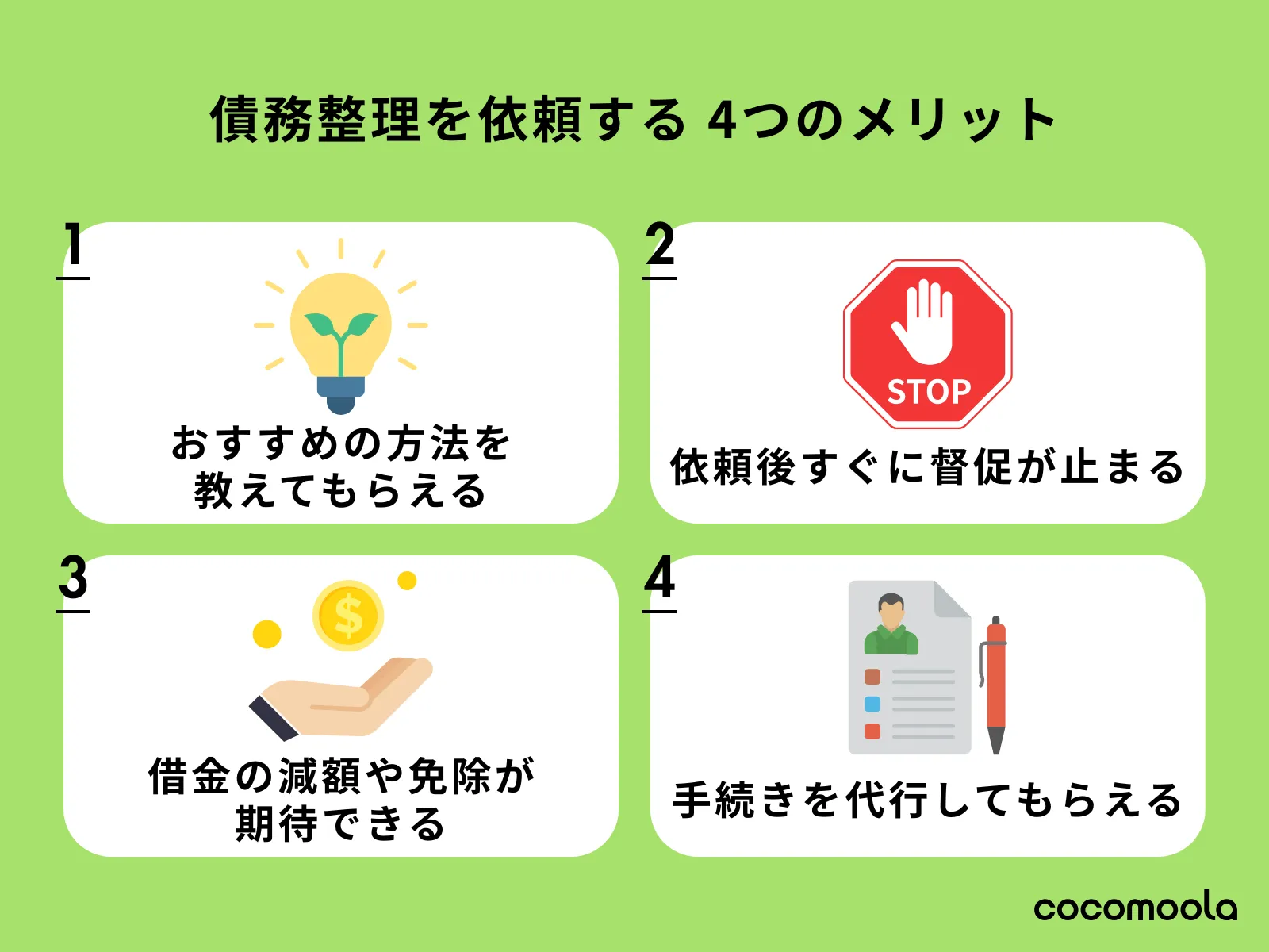 ここでは、債務整理を依頼するメリットについてご紹介します。プロである弁護士・司法書士に債務整理を依頼する主なメリットは以下の通りです。