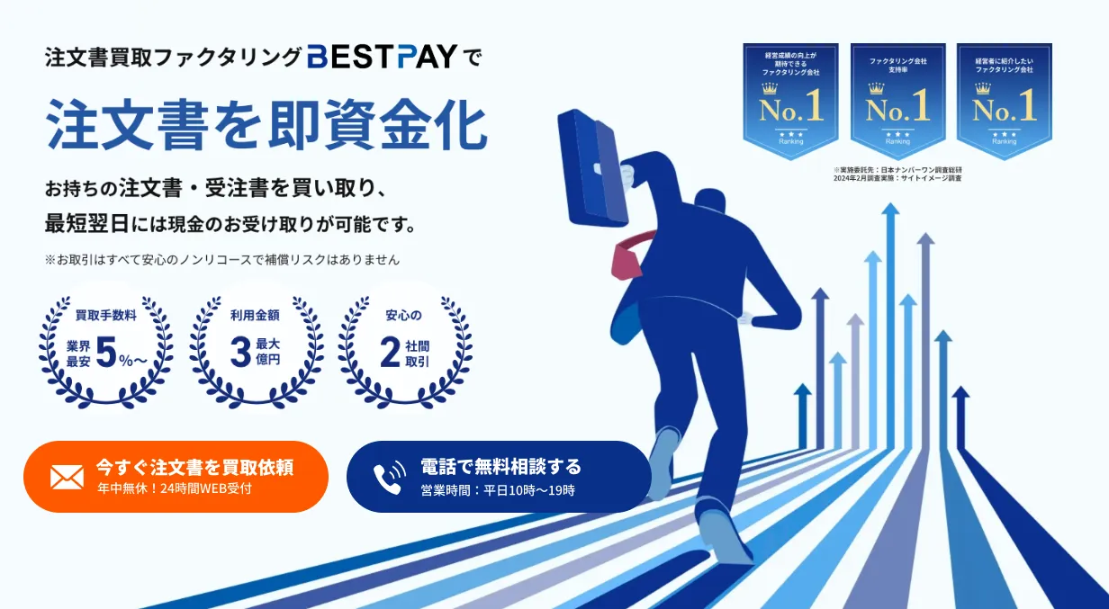 BEST PAY(ベストペイ)は、従来のファクタリングとは一味違った「注文書買取」というサービスを提供しています。