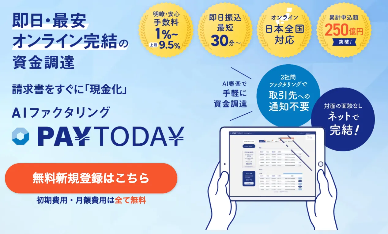 PAYTODAYは 法人・個人事業主・フリーランス向けのオンライン完結型ファクタリングサービスで、売掛債権(請求書)を売却することで資金を調達する「借りない資金調達」が特徴です。