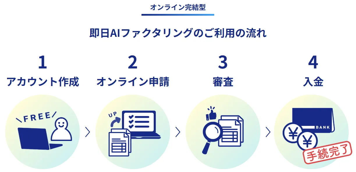 最大の特徴は 「AIファクタリング」 を採用している点です。独自のAI審査により、申し込みから審査、入金までがすべてオンラインで完結し、最短30分で振込ができます。