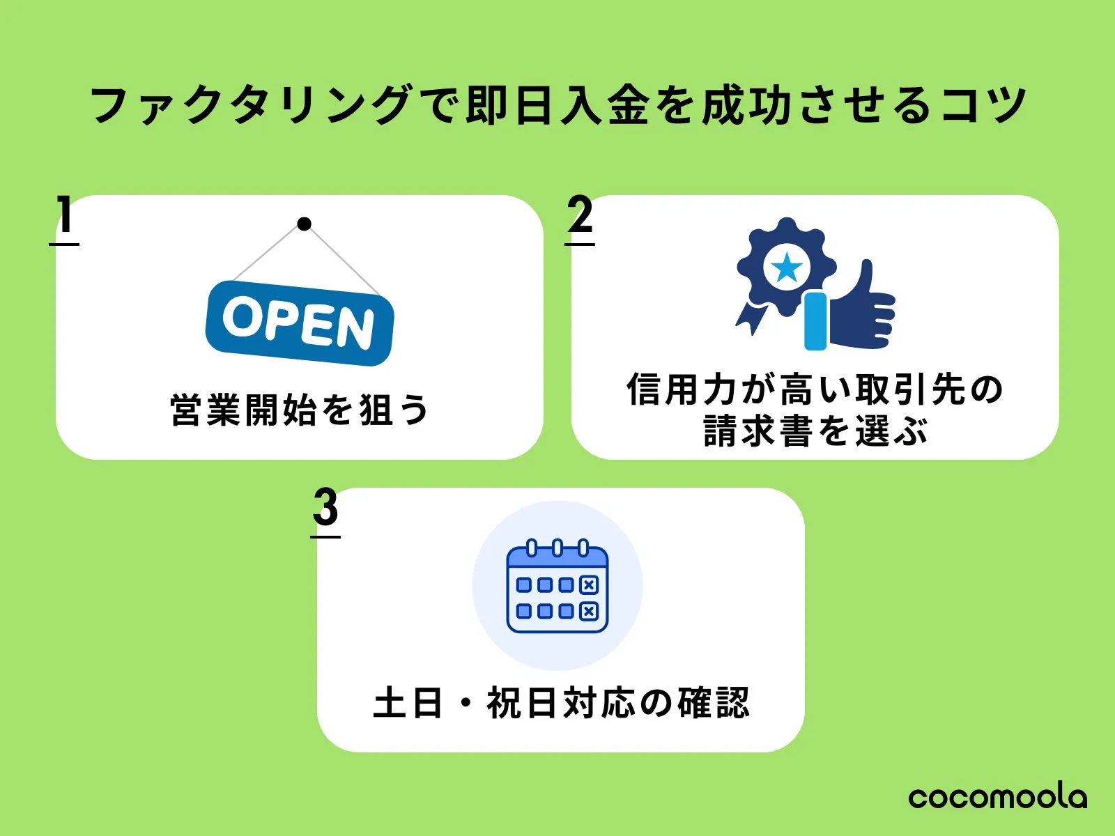 ここでは、ファクタリングで即日入金を成功させるコツについて解説します。