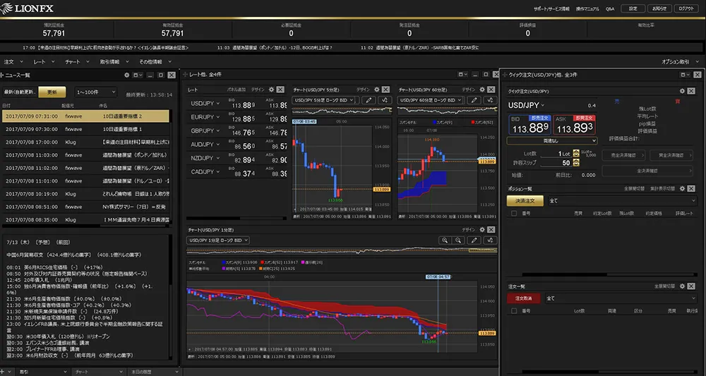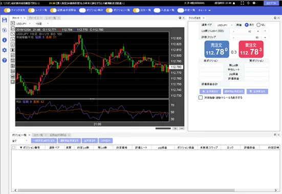 ┗チャート画面上にポジションや注文情報を表示可能。チャートを複数枚表示でき、本格分析もできる仕様です。