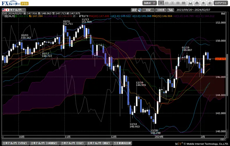 テクニカル指標も豊富で、移動平均線・ボリンジャーバンド・RSIに加え、一目均衡表やMACDなど専門的な指標も網羅しています。