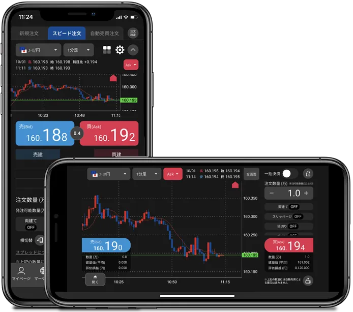 ┗レートをタップするだけで発注できる「スピード注文」機能を搭載。価格が動いた瞬間でもすぐに注文できるので、チャンスを逃しにくい設計になっています。