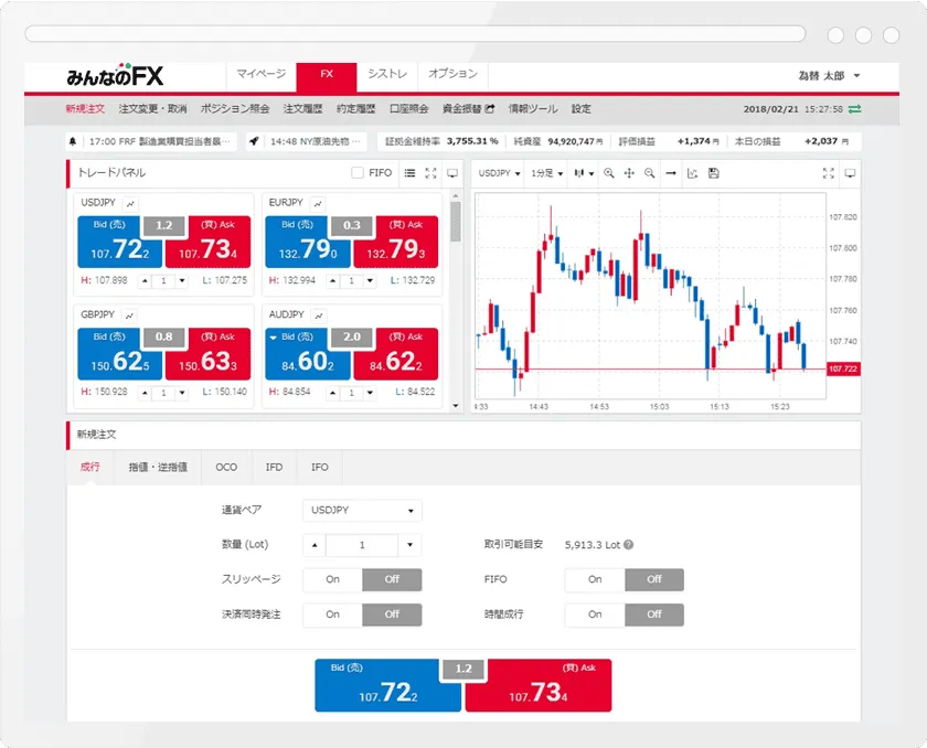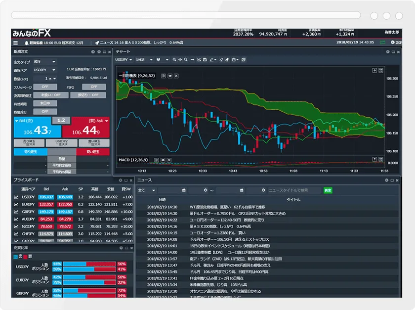 ┗レート・チャート・注文画面・ニュース・口座照会など、取引に必要な機能が一つの画面にまとまって表示されます。わざわざ画面を切り替えなくても操作できるため、スムーズにトレードできます。
