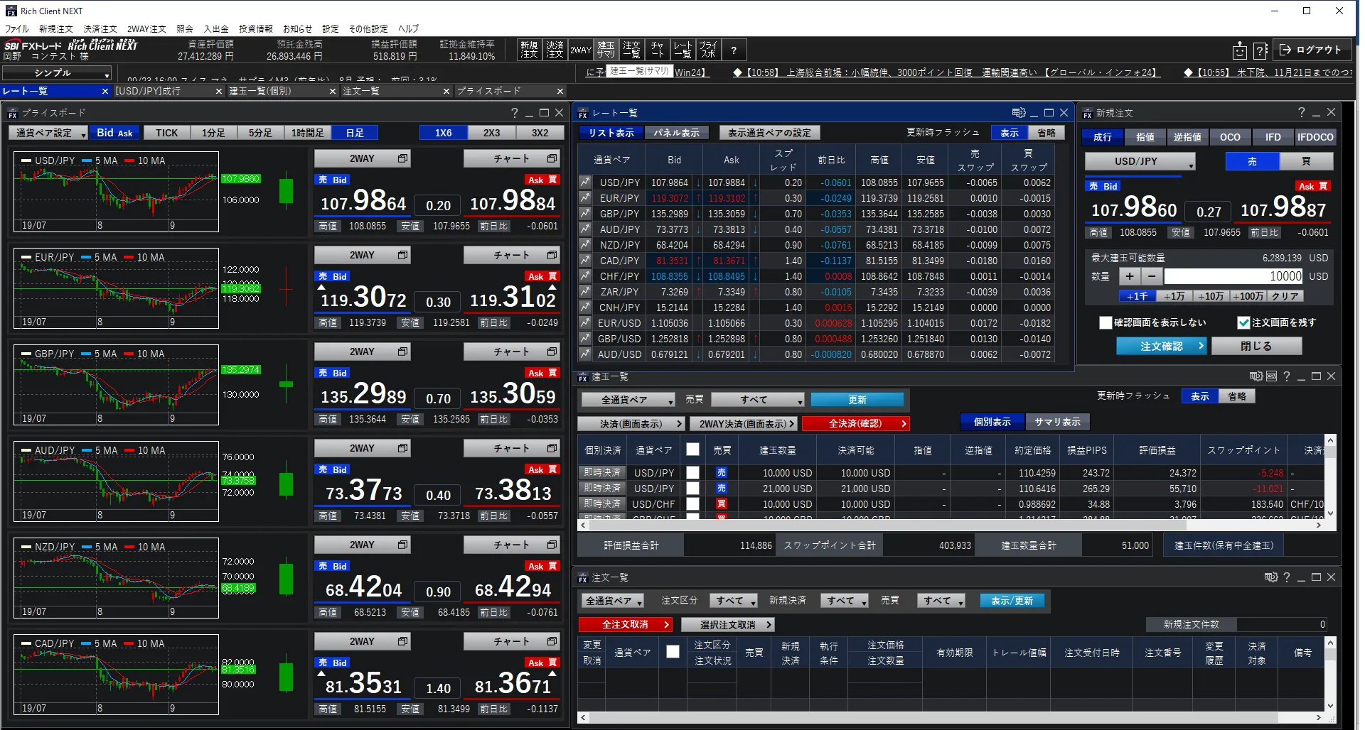 「Rich Client NEXT」は、SBI FXトレードが提供する高機能なPC向け取引ツールです。