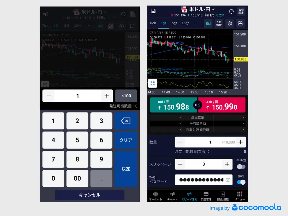 シンプルかつ丁寧に設計された画面構成で、初心者でも安心して使える印象。テクニカル機能も必要十分で、スマホでの注文もスムーズに行えます。