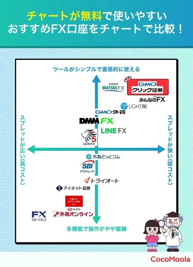 しかし、FX会社ごとに提供しているチャートはさまざまであり、アプリごとの使い勝手も変わってきます。強みも各社で異なることから、どのチャートを選べばいいか悩んでいる方も多いでしょう。またFX初心者の方の中には、「FXチャートを使うにはお金がかかるのではないか」と不安を抱えている方もいるかもしれません。