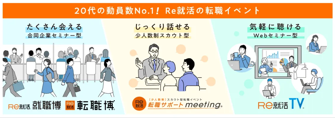 Re就活では、全国各地で開催される「転職博」や「転職サポートミーティング」などの転職イベントが豊富に用意されています。