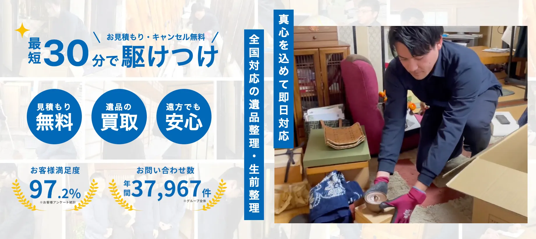 遺品整理や生前整理、特殊清掃やゴミ屋敷片付けなど、幅広く対応しているしあわせの遺品整理は全国で即日に対応可能。専任の遺品整理士がお伺いします。