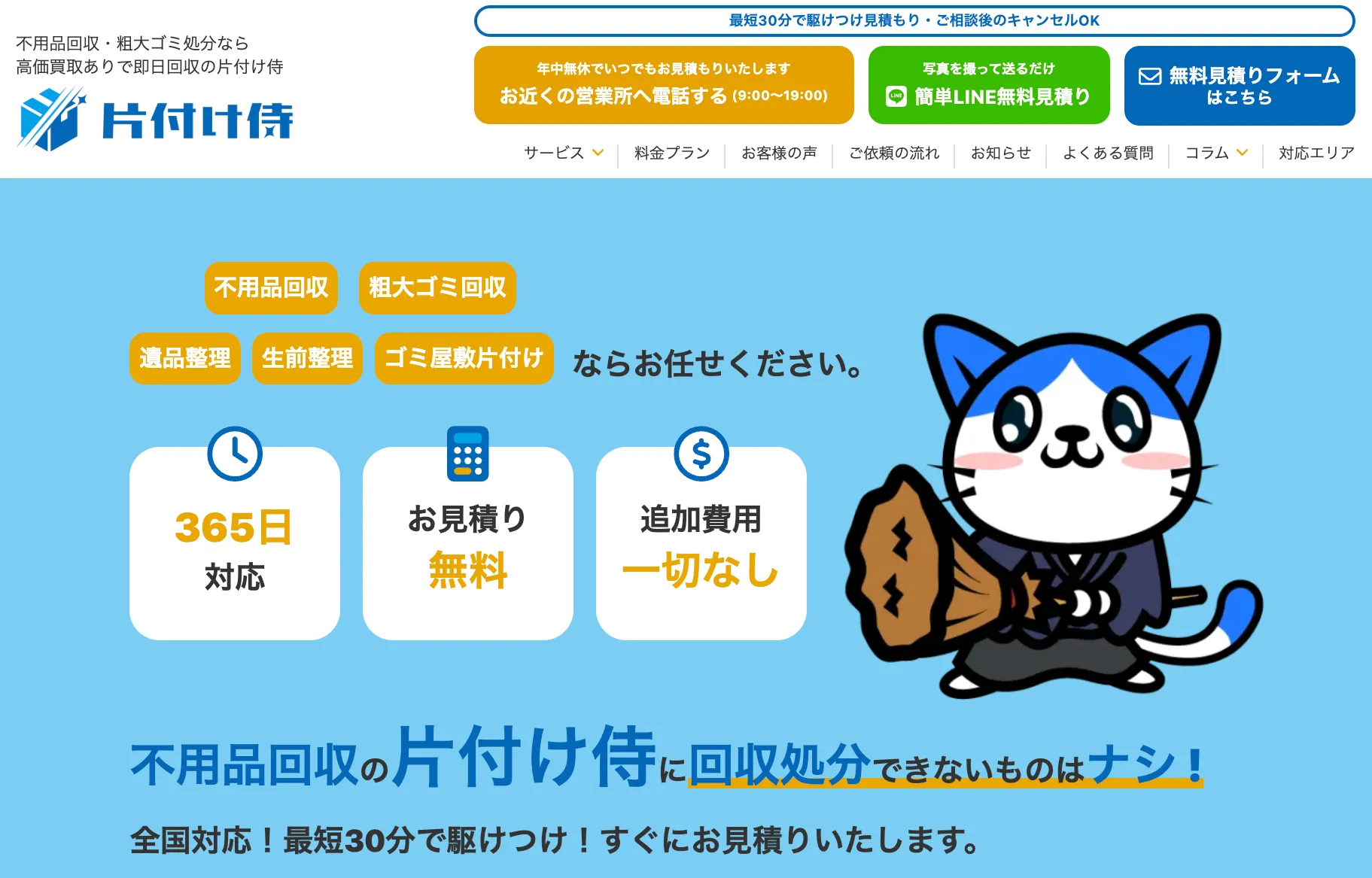 不用品回収・粗大ゴミ処分の片付け侍では、日本全国で不用品に関するお悩みを解決しています。最短30分、お見積り無料でお伺いいたします。