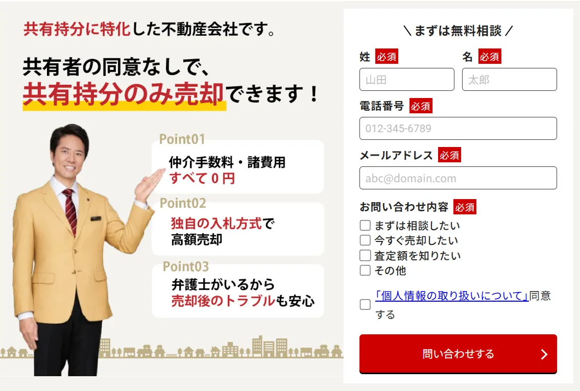 共有名義に詳しい弁護士と提携しており、トラブルになることなく“共有持分の売却”をすることができます。