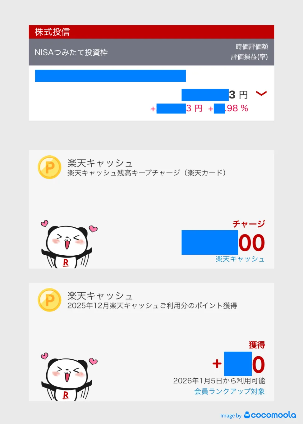 私が一番の魅力に感じているのは楽天ポイントが貯まる点です。楽天キャッシュを利用した積立では、毎回0.5%分の楽天ポイントが還元されるため、実質的におトクに投資ができていると感じています。